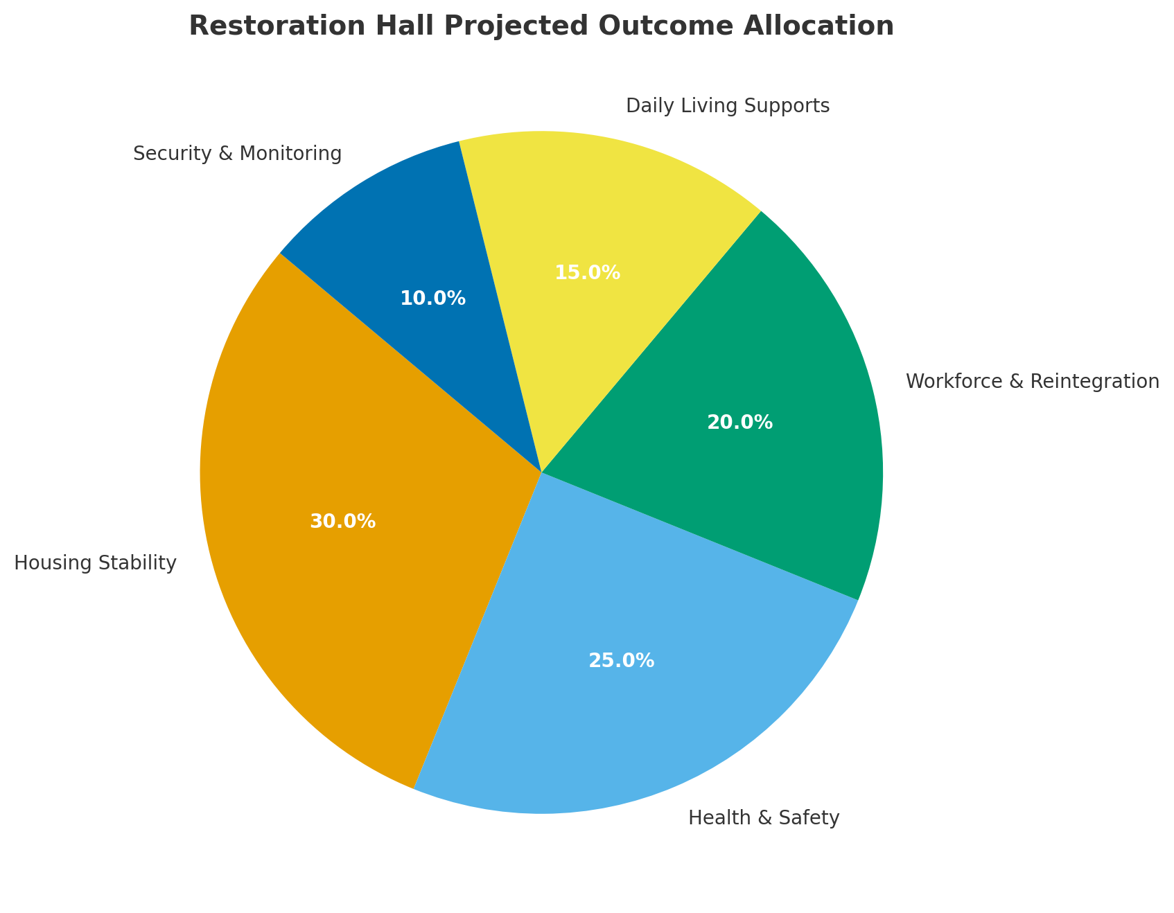 This chart illustrates how Restoration Hall anticipates distributing the outcomes and impact of its programs across key areas of service. Each category represents a central component of our comprehensive approach to helping veterans move from homelessness to homeownership and full reintegration into the community.