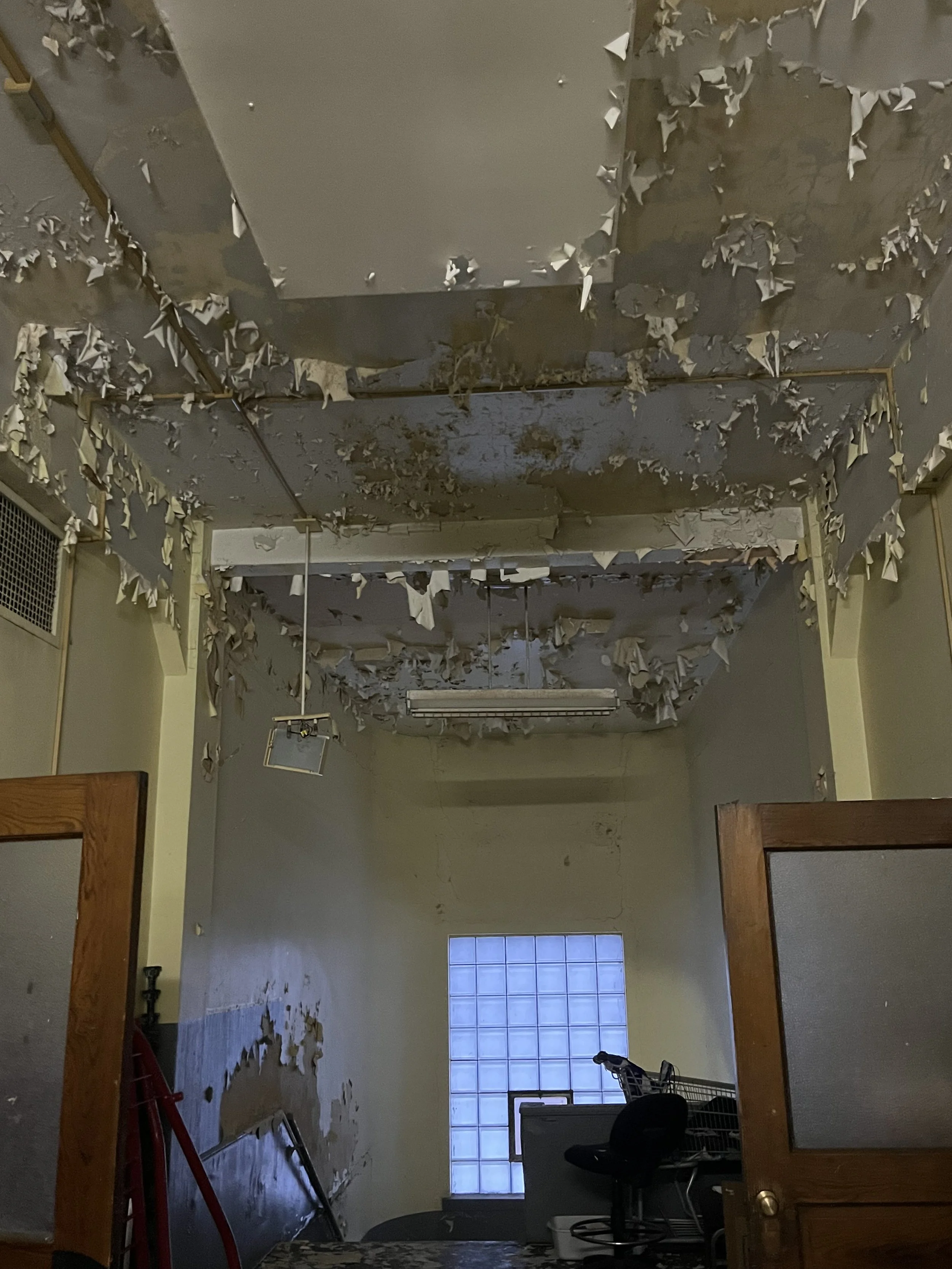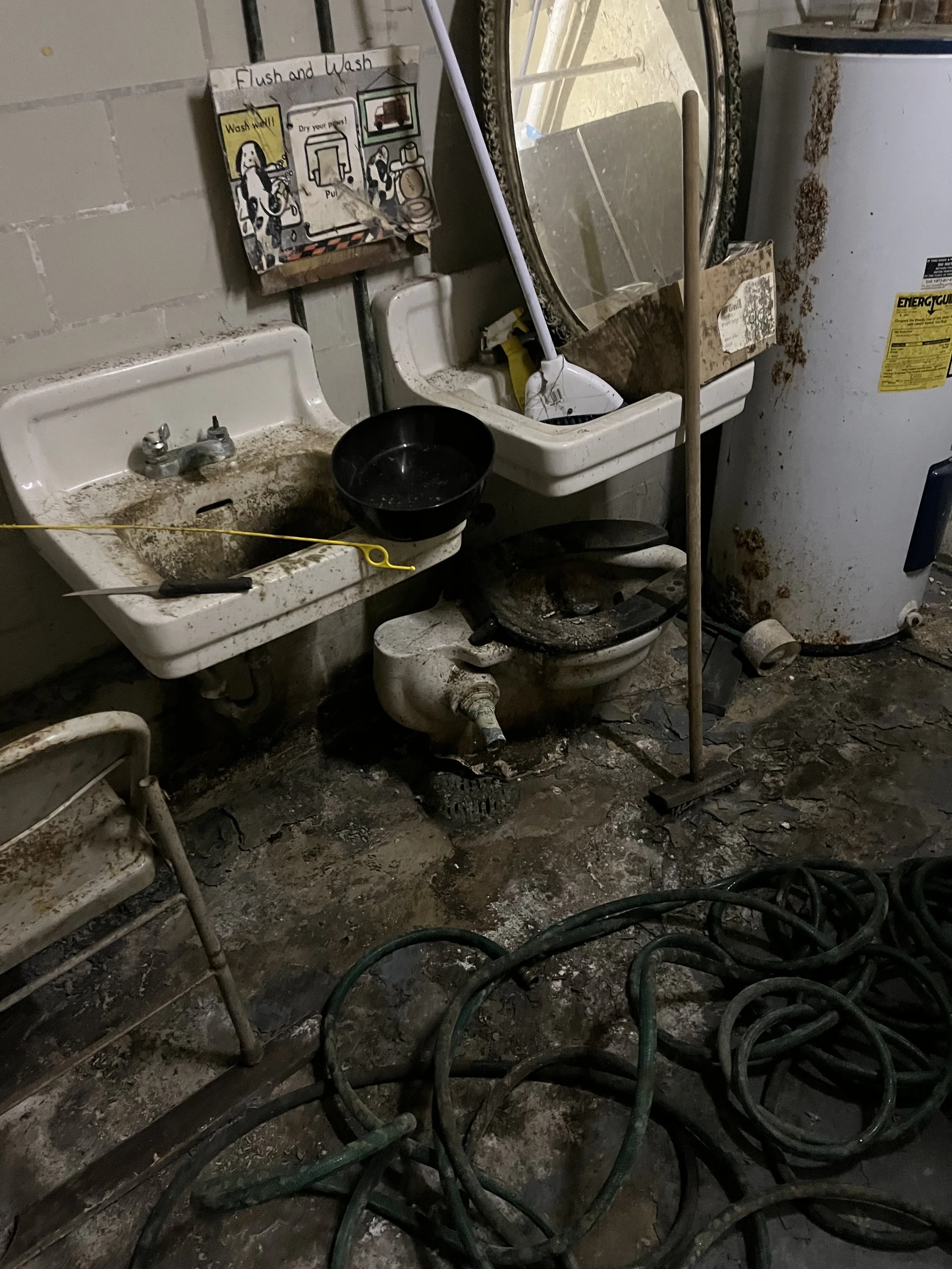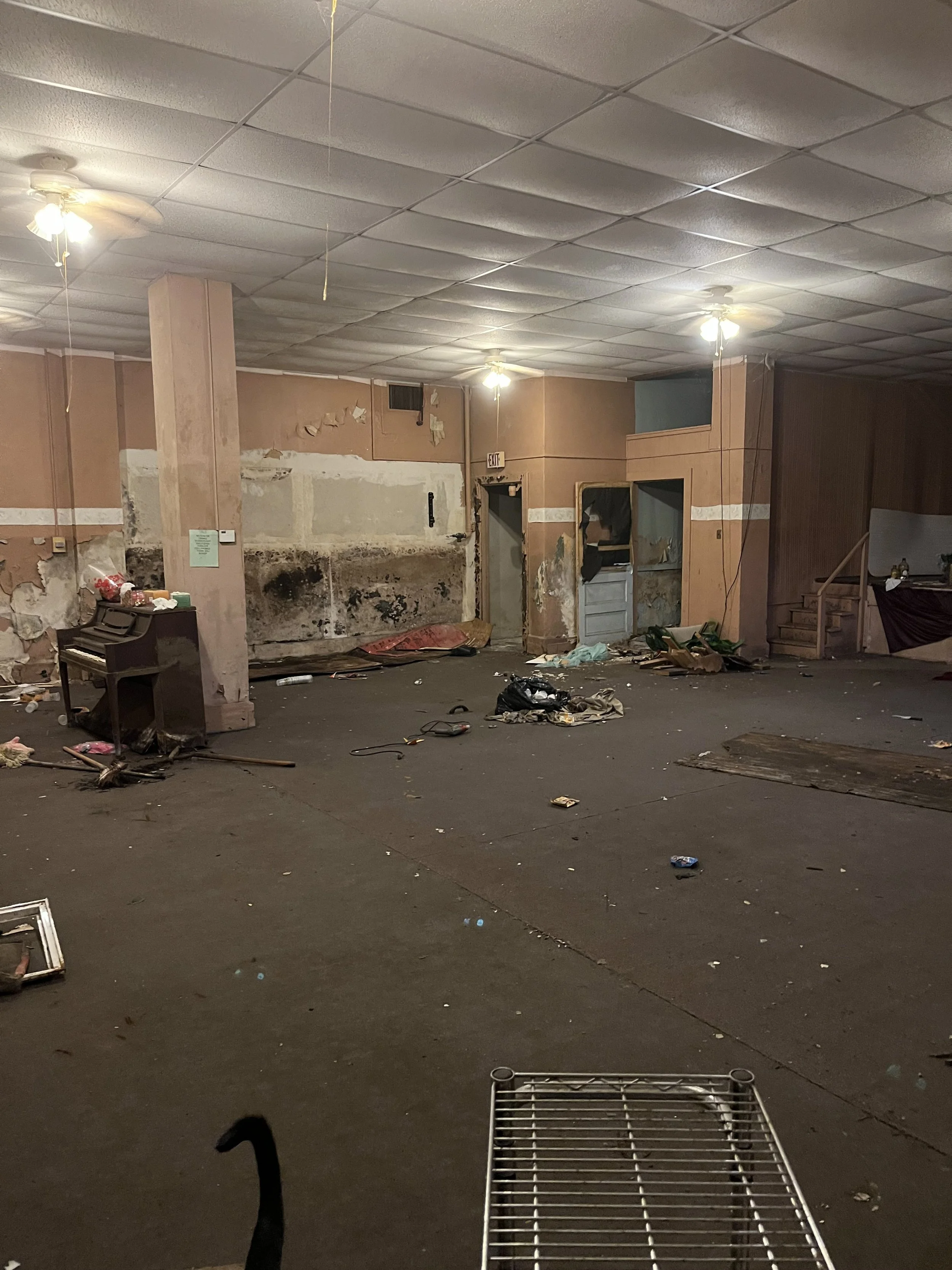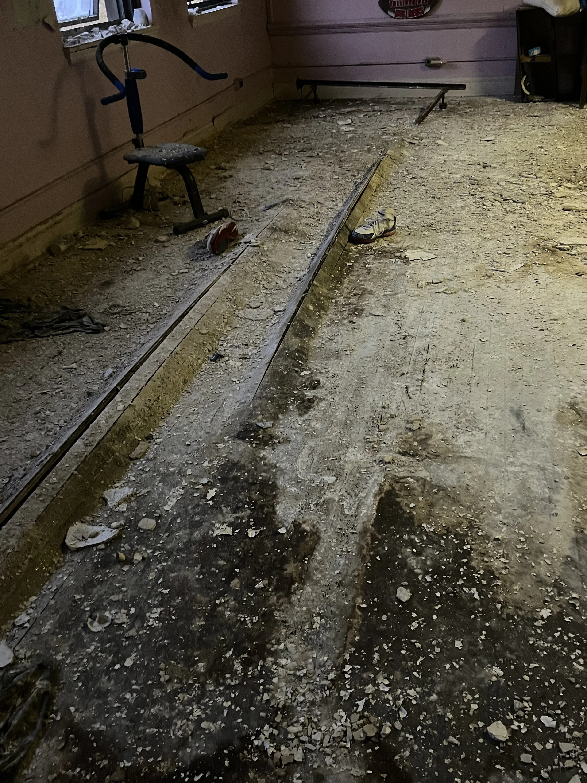 Remove all water-damaged and swollen flooring on the east side of the building as part of mold remediation. Secure subfloors for safe temporary use until Phase Two installation.