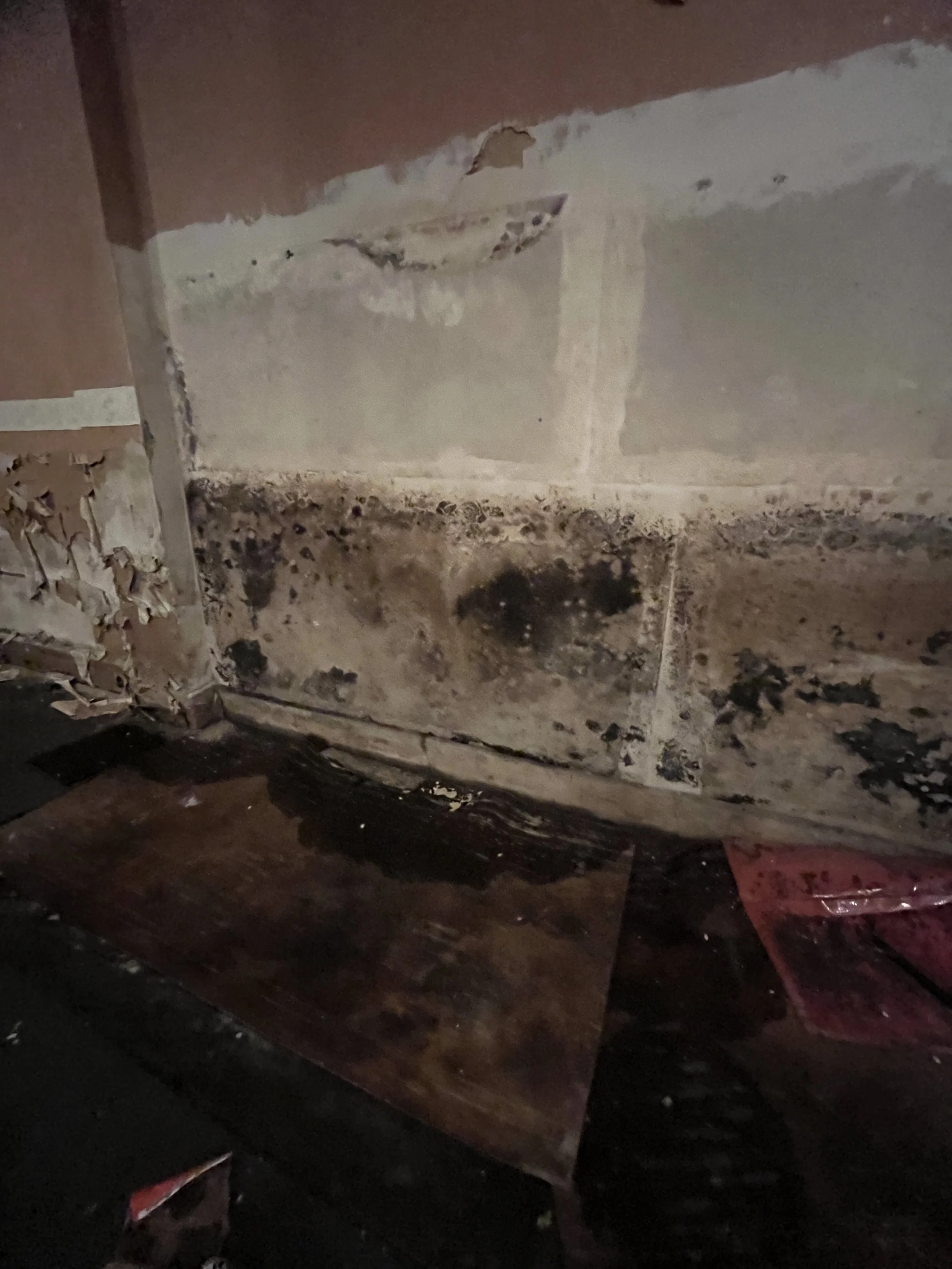 Address mold damage on the east side of the building caused by water intrusion. Remove contaminated materials, sanitize all affected areas, and conduct full-building air quality testing to ensure safe occupancy.